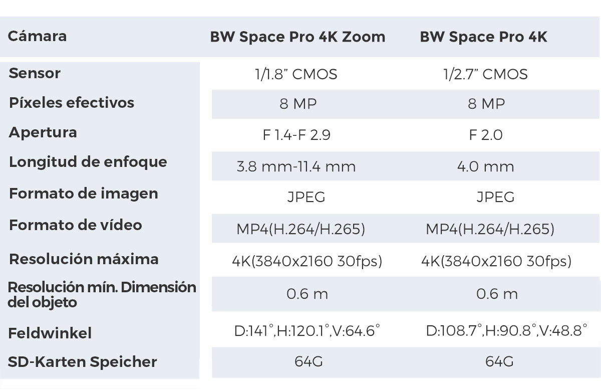 La tarjeta de memoria del BW Space Pro tiene una capacidad de 64 GB, y la duración de la grabación depende de la resolución y la velocidad de los fotogramas del vídeo. El BW Space Pro puede grabar 4,6 horas de vídeo 4K a 30 fps. La tarjeta de memoria está incorporada, y los usuarios no pueden sustituirla.