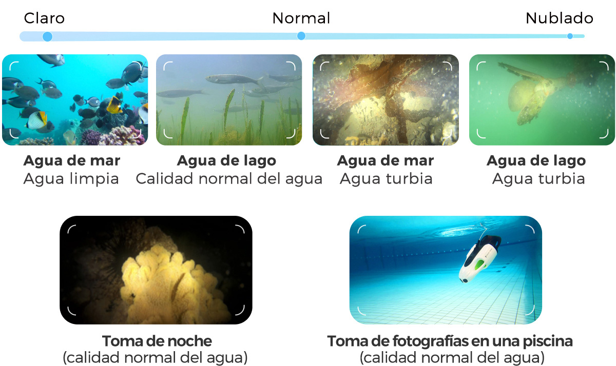 Esto depende de la calidad del agua y de la luz subacuática. La visibilidad normal es de 3,28~26,2 pies, y la visibilidad en aguas turbias es de unos 3,28 pies.