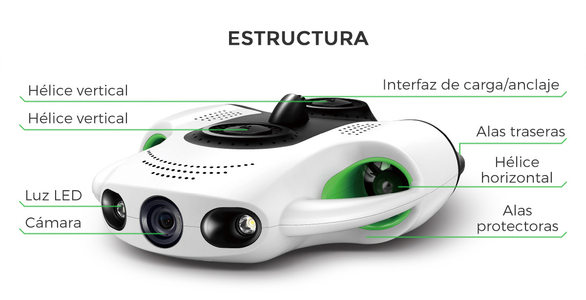 El dron subacuático de Youcan es uno de los más estables en cualquier tipo de agua. Utiliza cuatro motores para controlar la direccionalidad - dos para el movimiento horizontal, dos para el vertical - utilizando una estructura simétrica que mantiene el dron en movimiento constante - a una velocidad de hasta 1,5 metros por segundo.