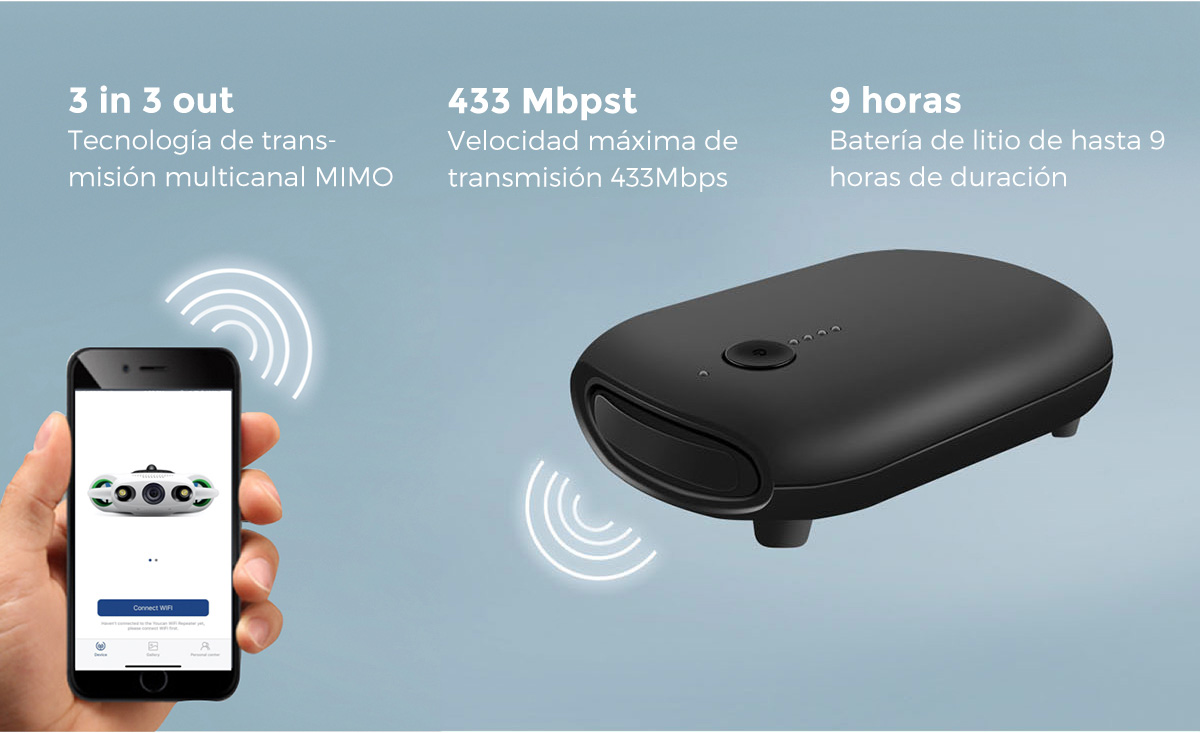 Utilizando una señal WiFi más avanzada que integra la tecnología MIMO y la transmisión multicanal, nuestros drones submarinos son capaces de transmitir una señal muy fuerte e ininterrumpida hasta 100 metros de distancia con una latencia muy baja.
